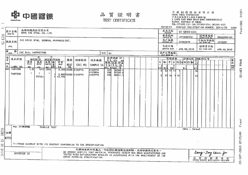 China steel corporation hazardous substances chemical contents declaration & warranty