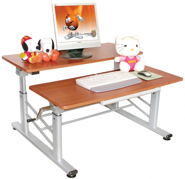 The Bossie Crank Workstation, Dual Desk, adjusts dual work surfaces to suit different users. Its ergonomic design makes for a perfect office work center.